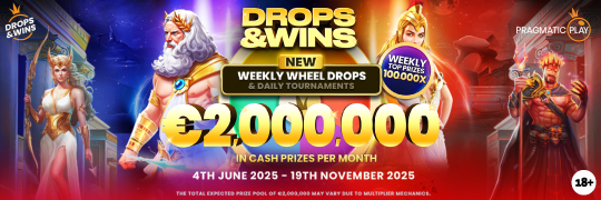 • The Drops & Wins’ Weekly Wheel Drops run every week from 4th June 2025 19:01 CEST until 19th November 2025 at 18:59 CET (the “Promotional Term”). This is a network promotion operated by Pragmatic Play and prize pools are shared across different operators.