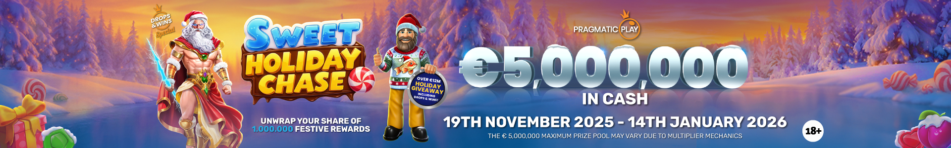 - The Sweet Holiday Chase Weekly Prize Drops run weekly from 19th November 2025 at 19:01 CET until 14th January 2026 at 18:59 CET (the “Promotional Term”). This is a network promotion operated by Pragmatic Play and prize pools are shared across different operators.